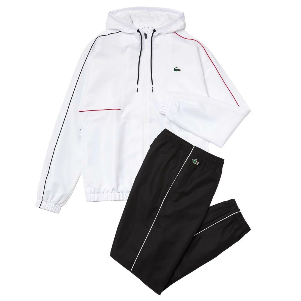 Contrast piping on sides of shoulders, sleeves and trousers, oversized crocodile on back of jacket, oversized Lacoste branding on sleeve